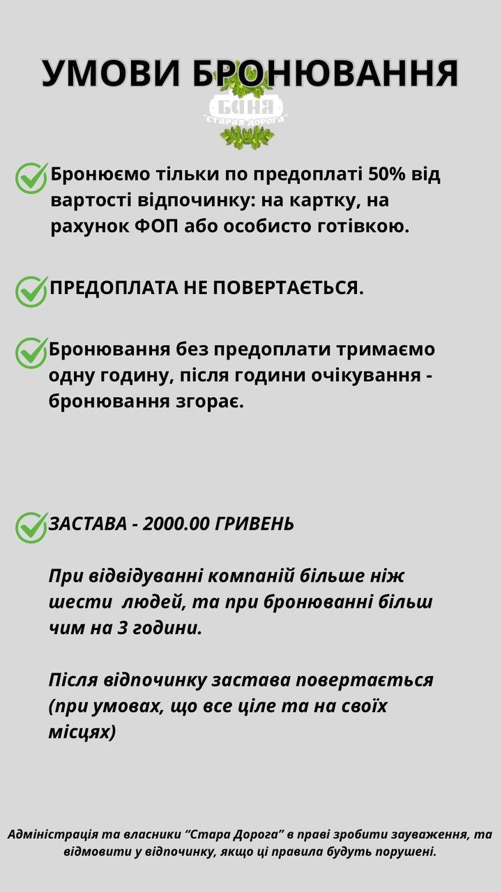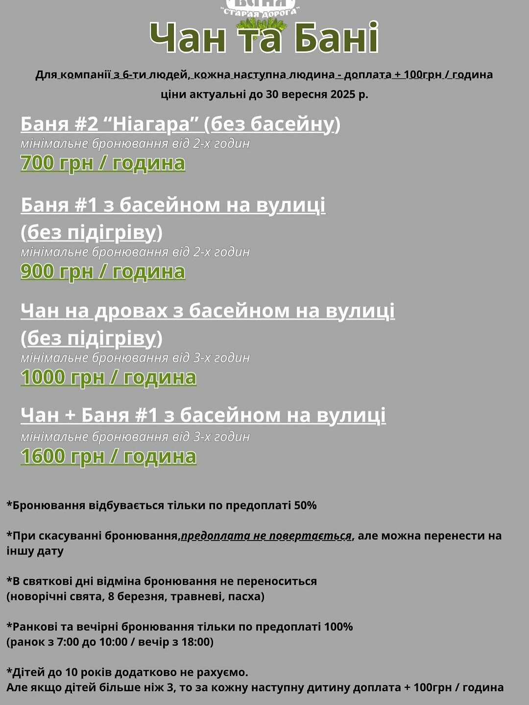 - Баня без басейну — 700 грн/година, мінімум 2 години.